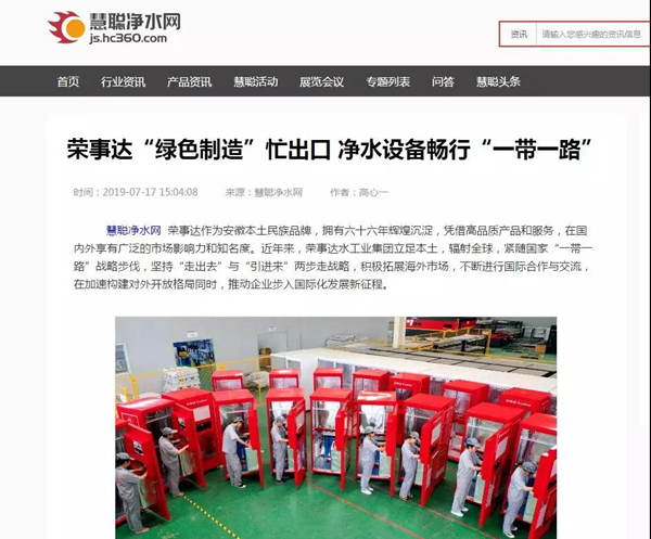 慧聰網 《榮事達“綠色制造”忙出口  凈水設備暢行“一帶一路”》