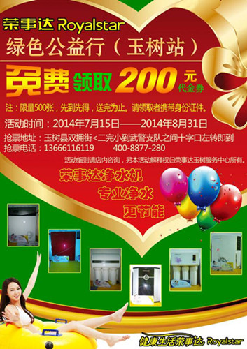 •     為實(shí)現(xiàn)“讓中國(guó)人喝上安全水”的夢(mèng)想,榮事達(dá)水工業(yè)公司將在全國(guó)開(kāi)展 “綠色公益行”活動(dòng),通過(guò)一系列為民、惠民的宣傳和服務(wù),關(guān)注居民飲水健康,倡導(dǎo)綠色生活。