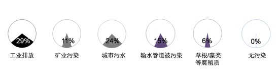 ——污染源:城市水污染主要與產業結構有關,工業排放(29%)和“礦業污染”(11%)對水資源的污染占到四成。值得關注的是,“城市污水”污染被24%被訪者認為其是主要污染源。蘭州水污染事件讓人們注意到了“輸水管道被污染”對水安全造成的影響,15%被訪者認為自己所住城市的水污染受此影響。有專家分析水污染,認為“草根、藻類等腐殖質”是主要原因之一,被訪者中6%接受這一看法。