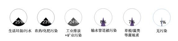 本次調查分別向被訪者所感受到的城市鄉村的水污染情況進行了解,其中重點調查了百姓認識到的本地水污染的源頭。