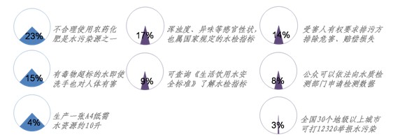 ——對于自己在水安全方面,有哪些權利、如何維護等問題,人們有所了解,但人數比例較低。例如17%知道“渾濁度、異味等感官性狀,也屬于國家規定的水質檢測指標”,而只有9%的人知道“想了解水質檢測有哪些指標,可查詢《生活飲用水安全標準》”;在維權方面,14%被訪者知道“受害人有權要求排污方排除危害、賠償損失”,8%知道“公眾可以依法向水質檢測部門申請檢測數據”,“目前全國有30個地級以上城市可撥打12320舉報水污染事件”,但只有3%的被訪者了解這一點,6%的被訪者對上述我們所提出的水安全知識表示“一概不知”。