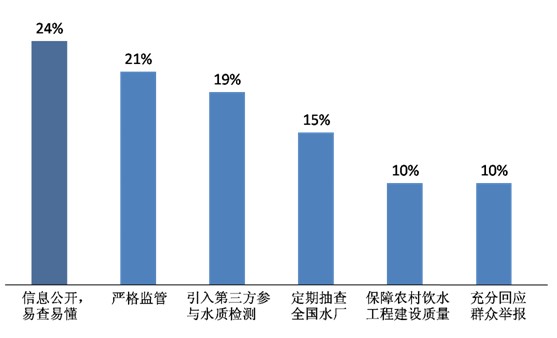 當我們問到“在水安全問題上,目前最希望政府做些什么”,不少被訪者選擇了“依法嚴格監管”(21%)、“引入第三方參與水質檢測”(19%)、“定期對全國的水廠進行抽查”(15%)和“保障農村飲水工程建設質量”(10%)。