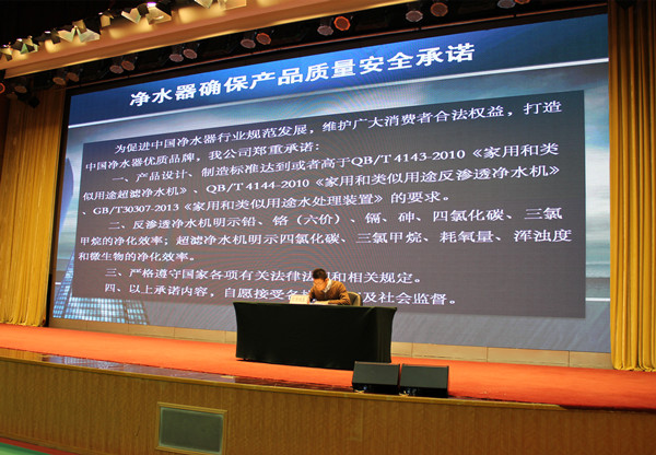 12月12日,合肥榮事達(dá)、浙江沁園、北京碧水源以及上海浩澤等18家凈水器生產(chǎn)企業(yè)代表齊聚國(guó)家質(zhì)檢總局,共同向社會(huì)做出質(zhì)量安全承諾,公開承諾:嚴(yán)格遵守國(guó)家各項(xiàng)有關(guān)法律法規(guī)和相關(guān)規(guī)定,接受社會(huì)監(jiān)督,產(chǎn)品設(shè)計(jì)、制造標(biāo)準(zhǔn)達(dá)到或者高于有關(guān)國(guó)家和行業(yè)標(biāo)準(zhǔn)要求,并明示對(duì)鉛、砷、四氯化碳、三氯甲烷等有害物質(zhì)的凈化效率。本次活動(dòng)是質(zhì)檢總局推動(dòng)企業(yè)標(biāo)準(zhǔn)自我聲明的一次重要活動(dòng)。