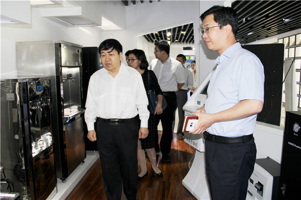在榮事達智能家電研發中心產品展示廳,領導們饒有興趣地參觀了榮事達凈水機展區,總經理支新郁講解了凈水機產品類型及所運用的反滲透過濾技術,并介紹了公司為唐山世界園藝博覽會、三亞鳳凰國際機場等場所安裝的商用凈水設備。當得知榮事達與印度德里公共事務委員會組織就新德里城區安裝自動售水設備項目達成合作意向,張博士一行人員對公司在凈水工程領域取得的突破表示了衷心的祝賀。