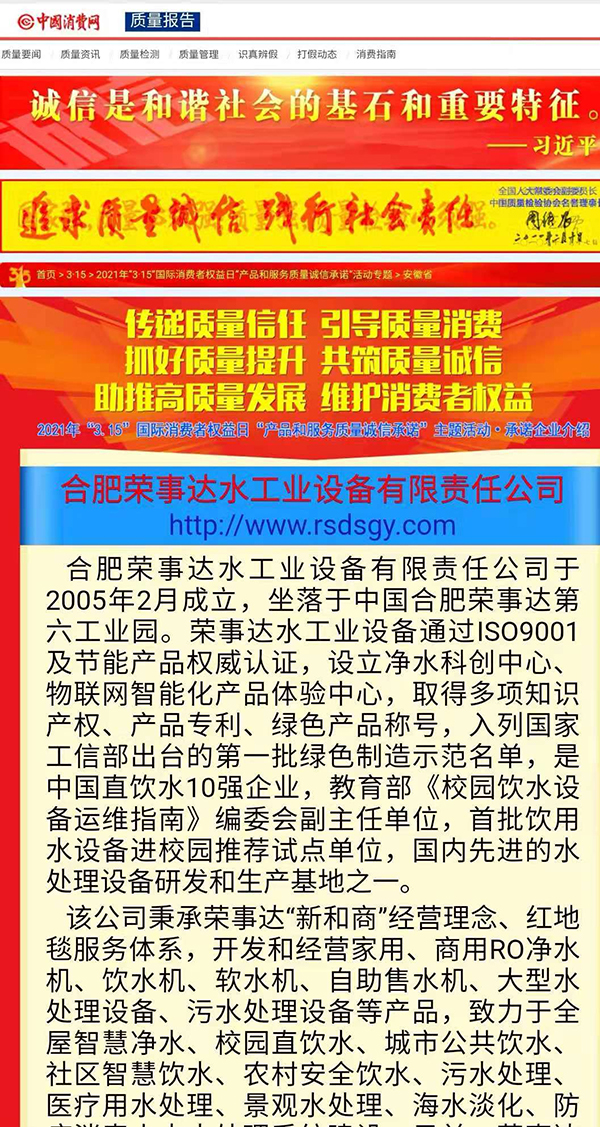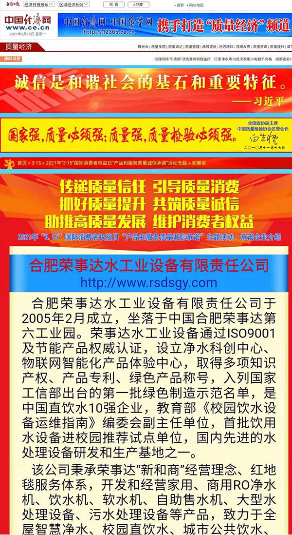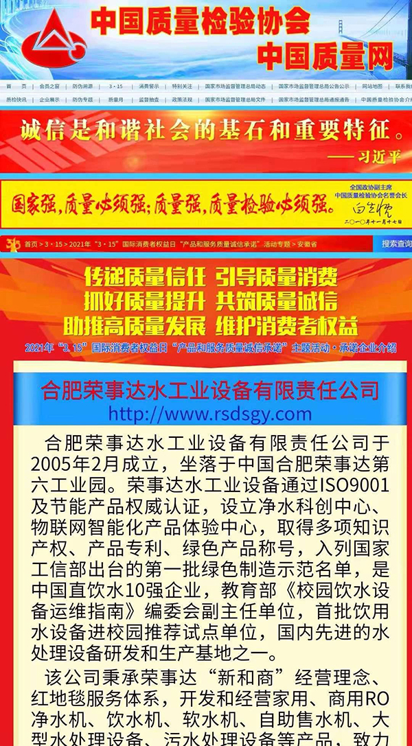 共筑質(zhì)量誠信,引導質(zhì)量消費。在由中國質(zhì)量檢驗協(xié)會主辦的2021年“3.15”產(chǎn)品和服務(wù)質(zhì)量誠信承諾的主題活動中,榮事達憑借卓越的產(chǎn)品品質(zhì)及良好的社會形象,獲得協(xié)會以及權(quán)威專家的一致認可,榮膺 “全國產(chǎn)品和服務(wù)質(zhì)量誠信示范企業(yè)”“全國質(zhì)量信得過產(chǎn)品”“全國凈水行業(yè)質(zhì)量領(lǐng)先品牌” “全國質(zhì)量誠信先進企業(yè)”多項榮譽,《中國質(zhì)量報》、《中國消費者報》及中國質(zhì)量網(wǎng)、中國經(jīng)濟網(wǎng)、中國消費網(wǎng)等多家媒體均予以集中展示和公告。