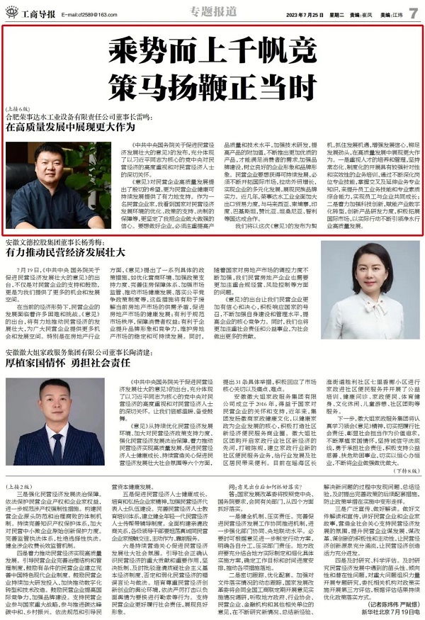 - 媒體聚焦|工商導(dǎo)報(bào)“合肥榮事達(dá)水工業(yè)設(shè)備有限責(zé)任公司董事長(zhǎng)雷鳴:在高質(zhì)量發(fā)展中展現(xiàn)更大作為”
