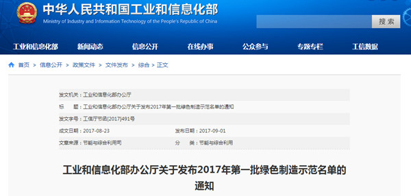 為貫徹落實《中國制造2025》,深入實施綠色制造工程,加快構建綠色制造體系,率先打造一批綠色制造先進典型,工信部確定了2017年第一批綠色制造示范...