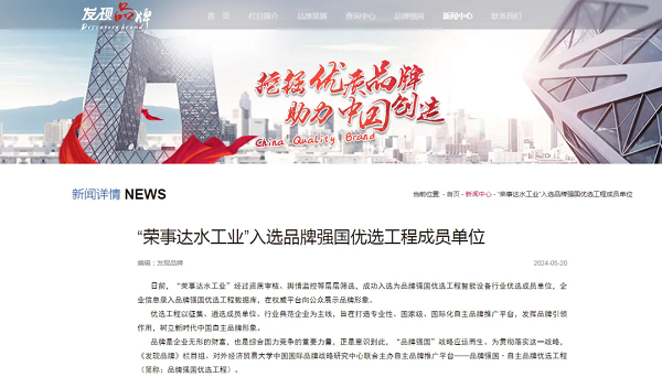 5月20日,發現品牌官網、品牌強國優選工程官網、網易、今日頭條發表了“‘榮事達水工業’入選品牌強國優選工程成員單位”的文章,文中肯定了榮事達水工...