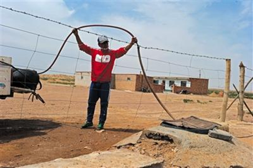額里斯鎮特莫烏拉嘎察(村民組),是最接近化工園區的村民組,最近的居民離化工園區不過1公里。20歲的巴特爾(化名)就是這里的居民,記者看到他正在用太陽能發電機,從自家水井抽水注入儲水皮囊中,準備澆灌幾里外菜園里的青菜。巴特爾的家在騰格里沙漠水源地上游,幾年前幾米下就能抽上水,現在水位下降至少40多米。